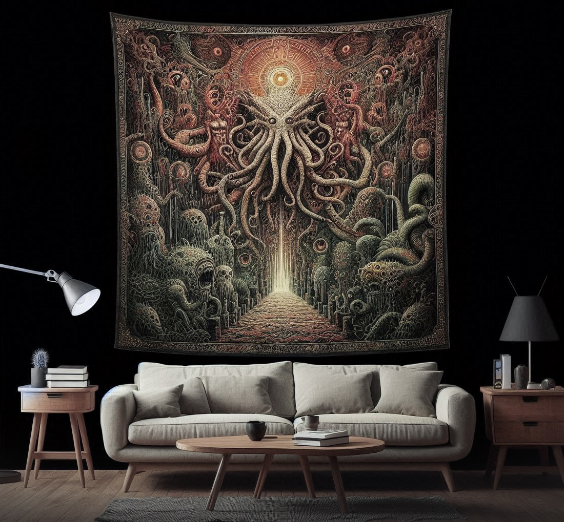 Adorn your walls with our Tapestries of Madness, depicting unsettling scenes from Lovecraft's stories.